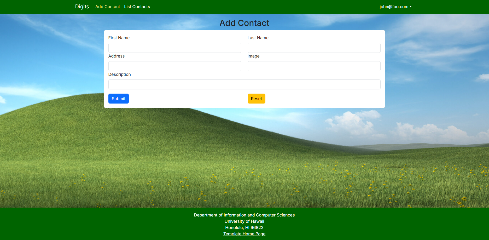 User home page After successfully logging in, the system takes you to your home page. It is just like the landing page, but the NavBar contains links to list contact and add new contacts: