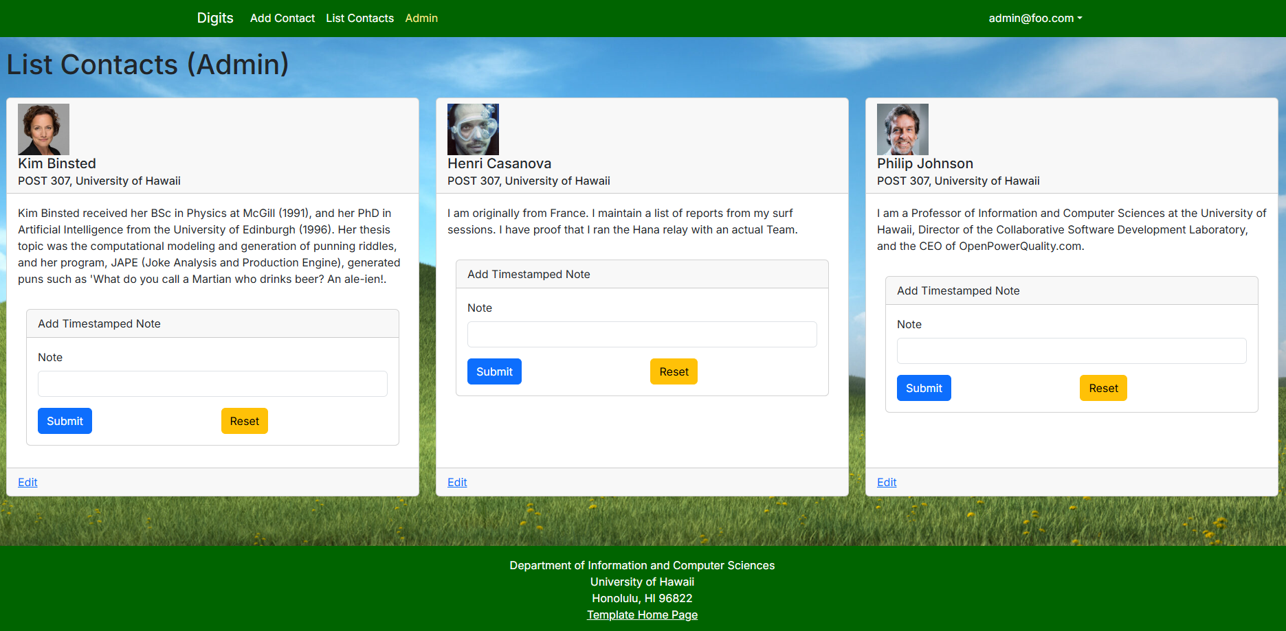 Admin mode It is possible to designate one or more users as “Admins” through the settings file. When a user has the Admin role, they get access to a special NavBar link that retrieves a page listing all Contacts associated with all users: