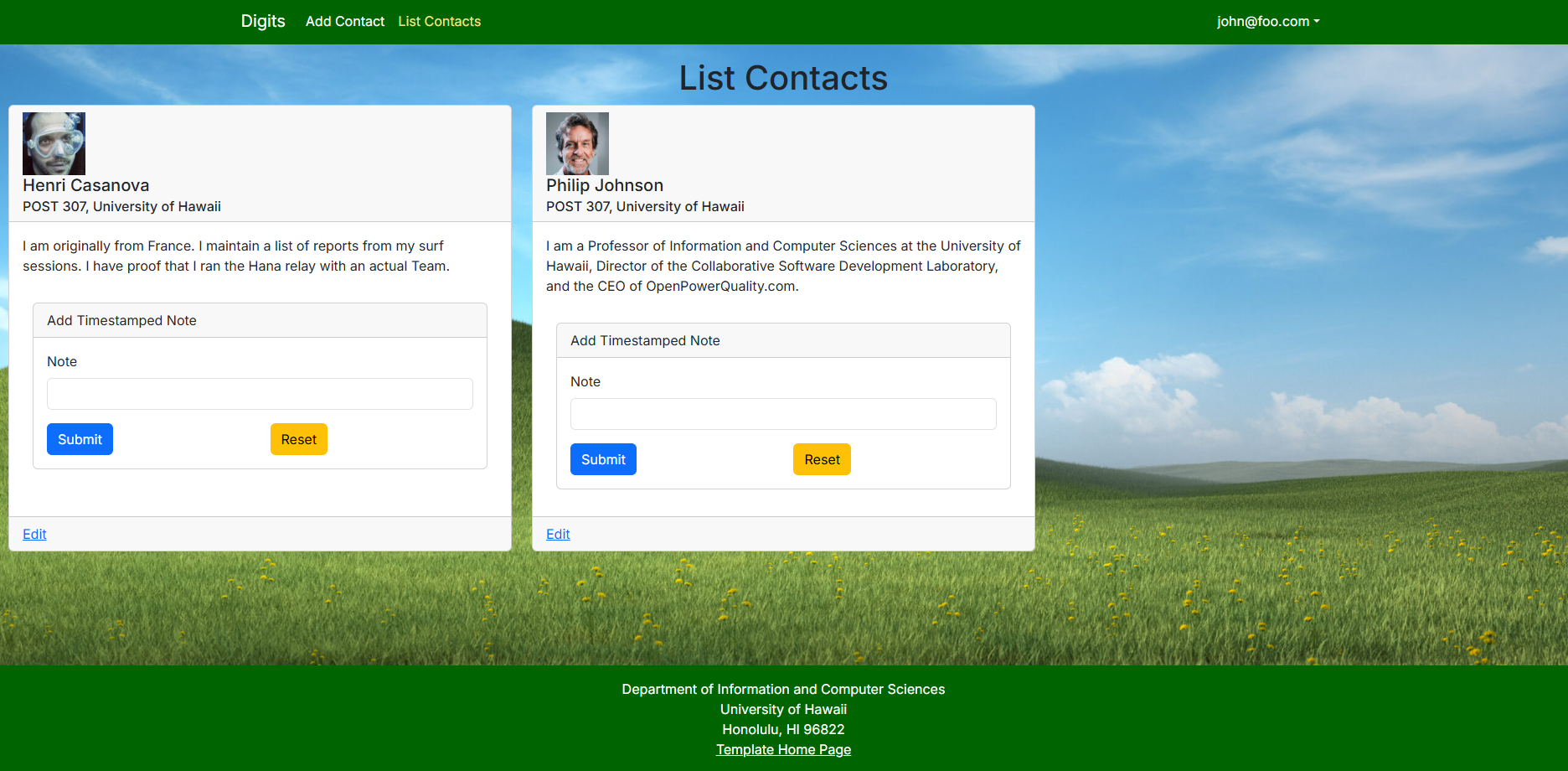 List Contacts Clicking on the List Contacts link brings up a page that lists all of the contacts associated with the logged in user: